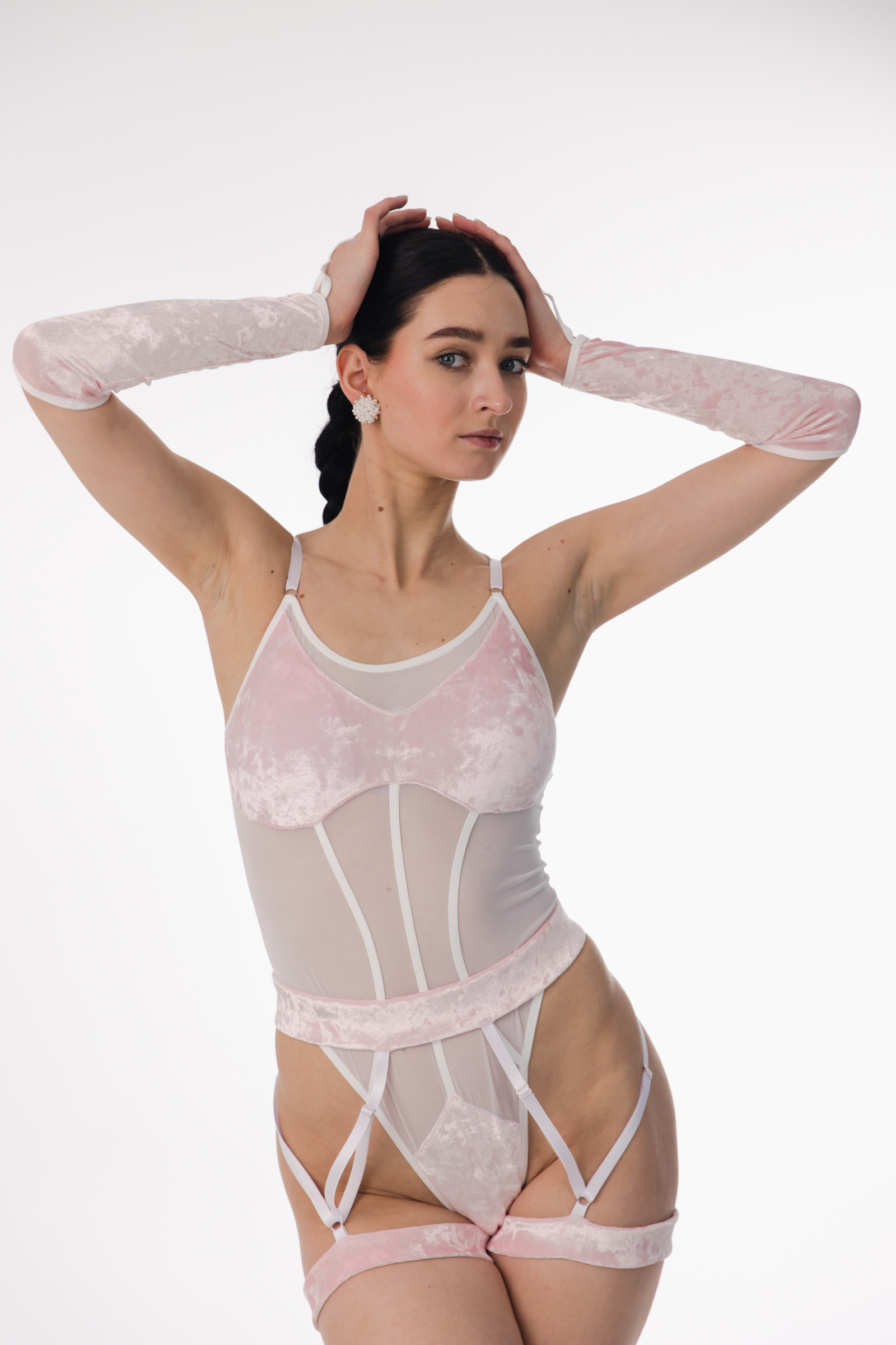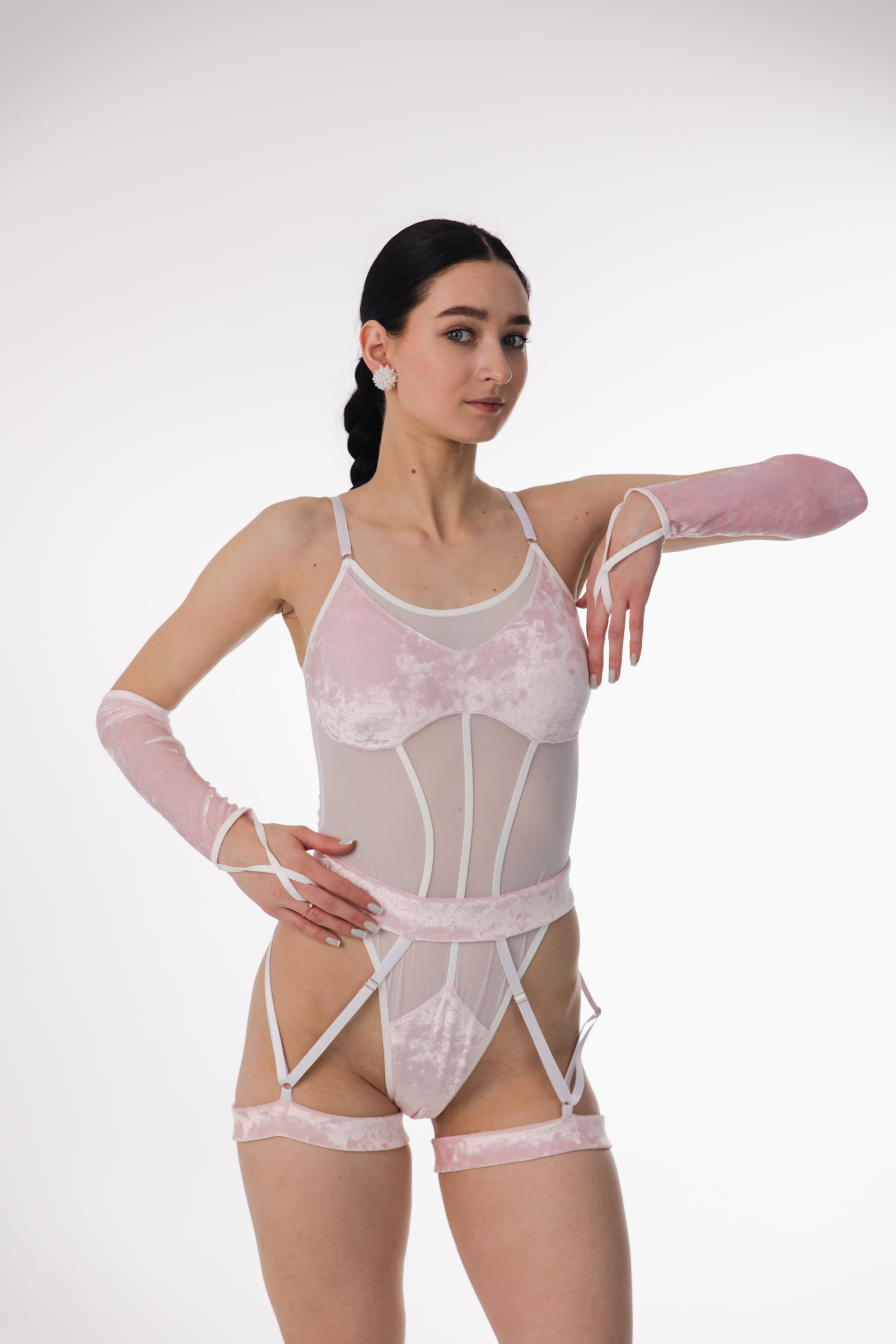 Step into elegance and softness with the ASTREA Bodysuit, inspired by the celestial goddess of purity and light. This delicate design blends soft velvet with sheer mesh panels, creating a graceful and feminine silhouette that feels both sensual and refined. The corset-inspired lines sculpt the body beautifully, while adjustable garter straps and long velvet gloves add a sophisticated, stage-ready touch. Designed for dancers who appreciate elegance and confidence, the ASTREA bodysuit is perfect for pole dance, exotic performances, and artistic photoshoots.