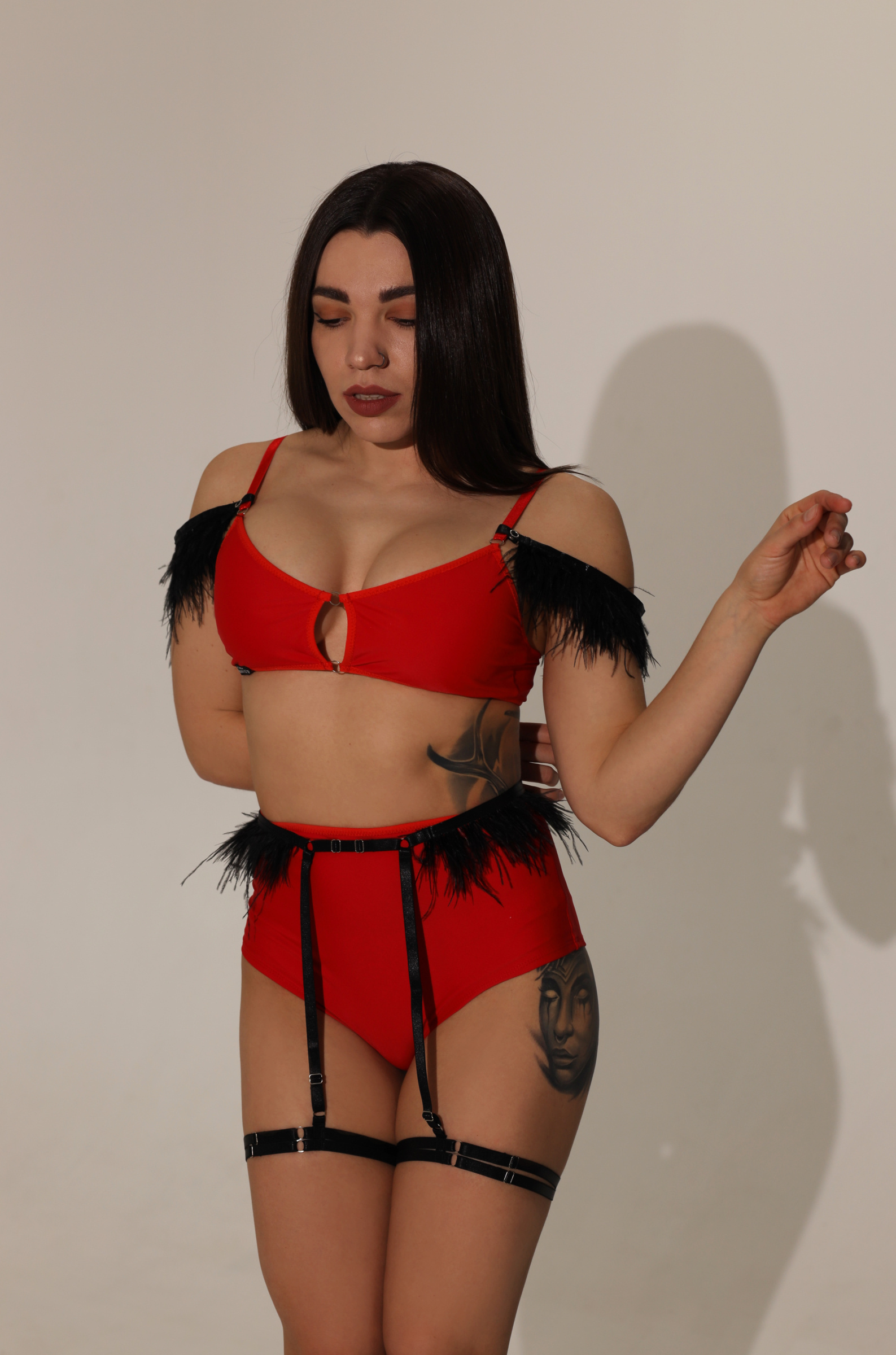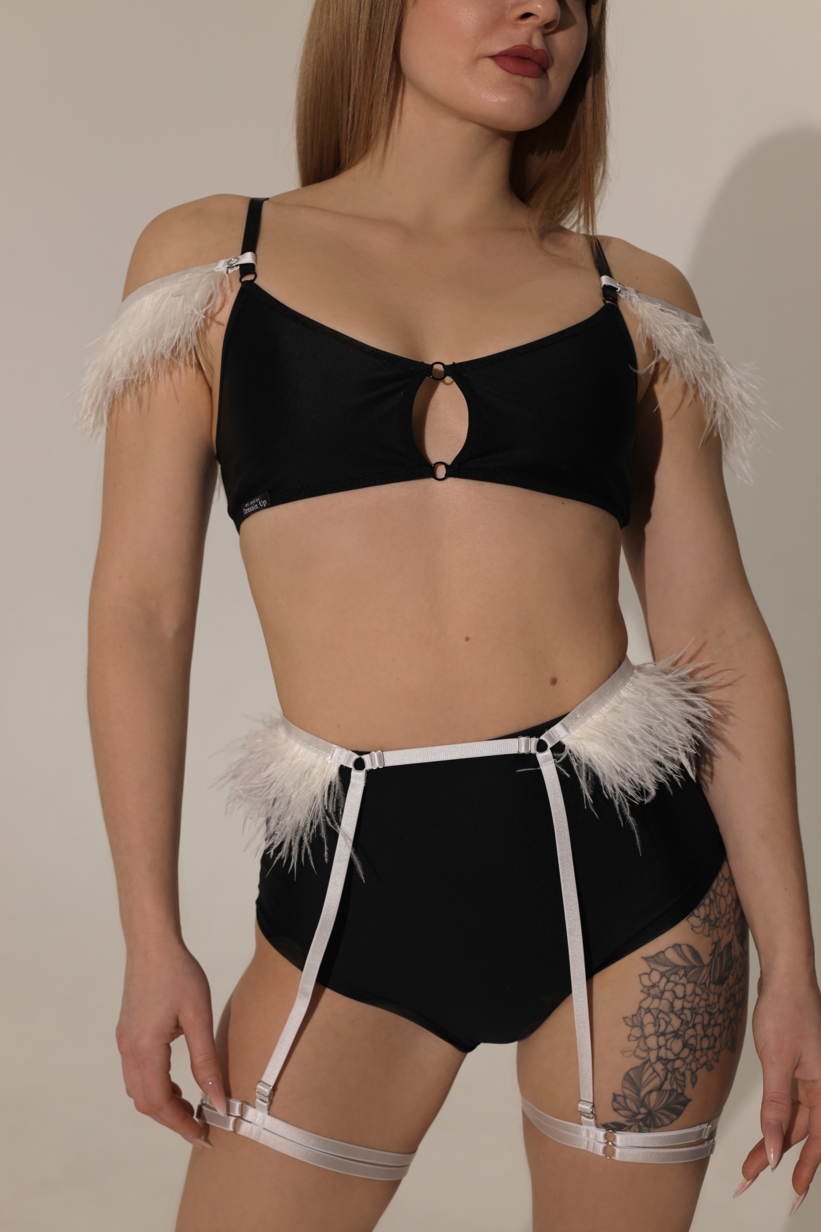 Sensual, playful, and effortlessly chic — the CHARM set adds a touch of glamour to your movement. Crafted with delicate feathers, soft stretch fabric, and shiny nickel accents, this two-piece design highlights your silhouette while offering full comfort and flexibility. Perfect for pole dance, exotic, twerk, or performance shows where style meets motion.