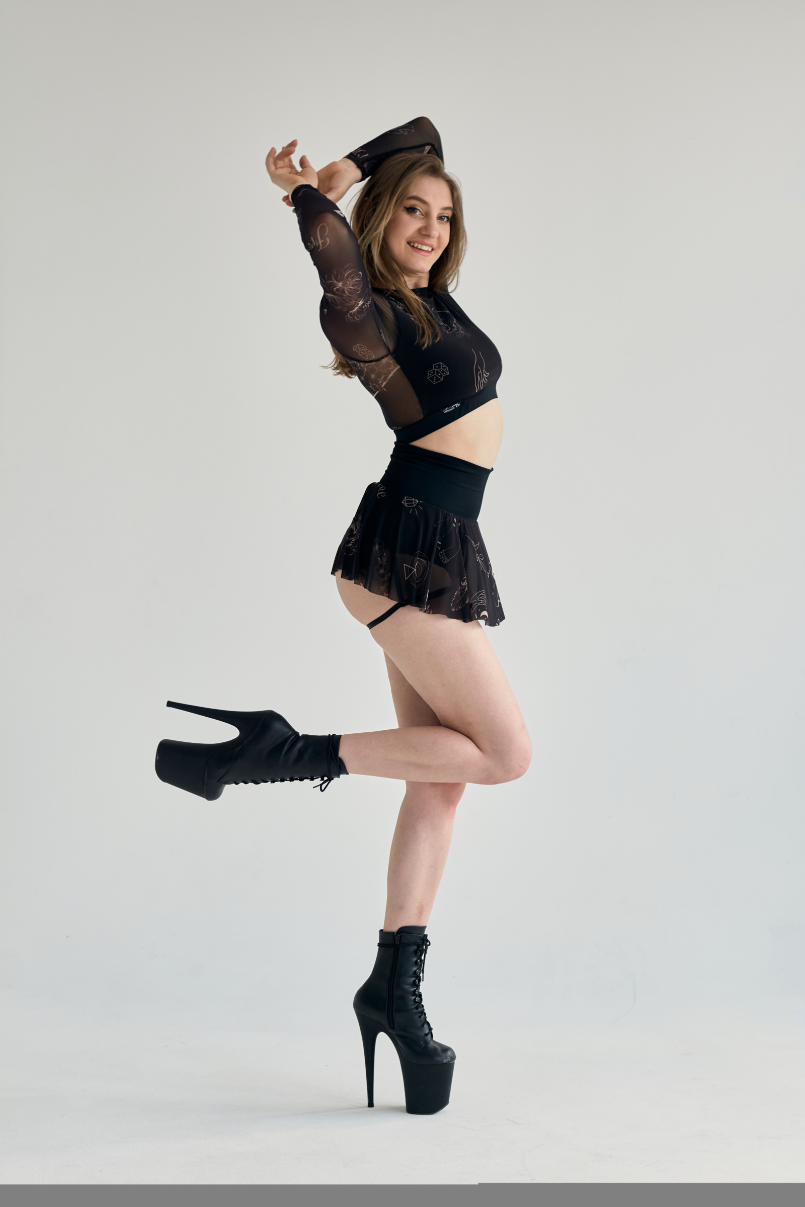 Inspired by art, shaped by movement — the Dance Tattoo Shorts bring your personality to life. The semi-sheer mesh overlay features delicate tattoo-style motifs, adding a unique visual texture to every pose. The high waist and double belt subtly sculpt the body, while soft stretch fabric ensures a flawless, confident fit. Perfect for dancers and performers who express their story not only through motion but through style.