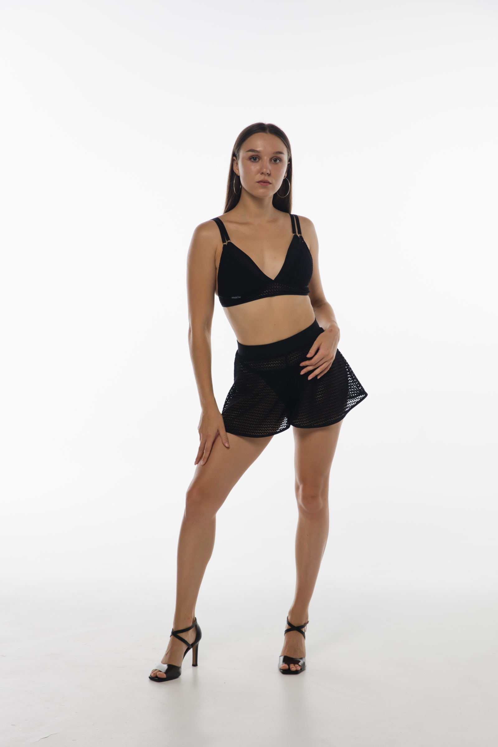 Light, elegant, and dynamic — the MUSE 2 Set blends minimalism, comfort, and movement. The semi-transparent stretch mesh creates a delicate silhouette that flows beautifully with your body. This three-piece set includes a triangle-cup top, high-waisted mesh skirt-shorts, and a thong, designed to accentuate your shape and provide full freedom of motion. Perfect for Pole Dance, Exotic, High Heels, Twerk, Floorwork, Stretching, Yoga, Fitness, Aerial Arts, and stage performances.