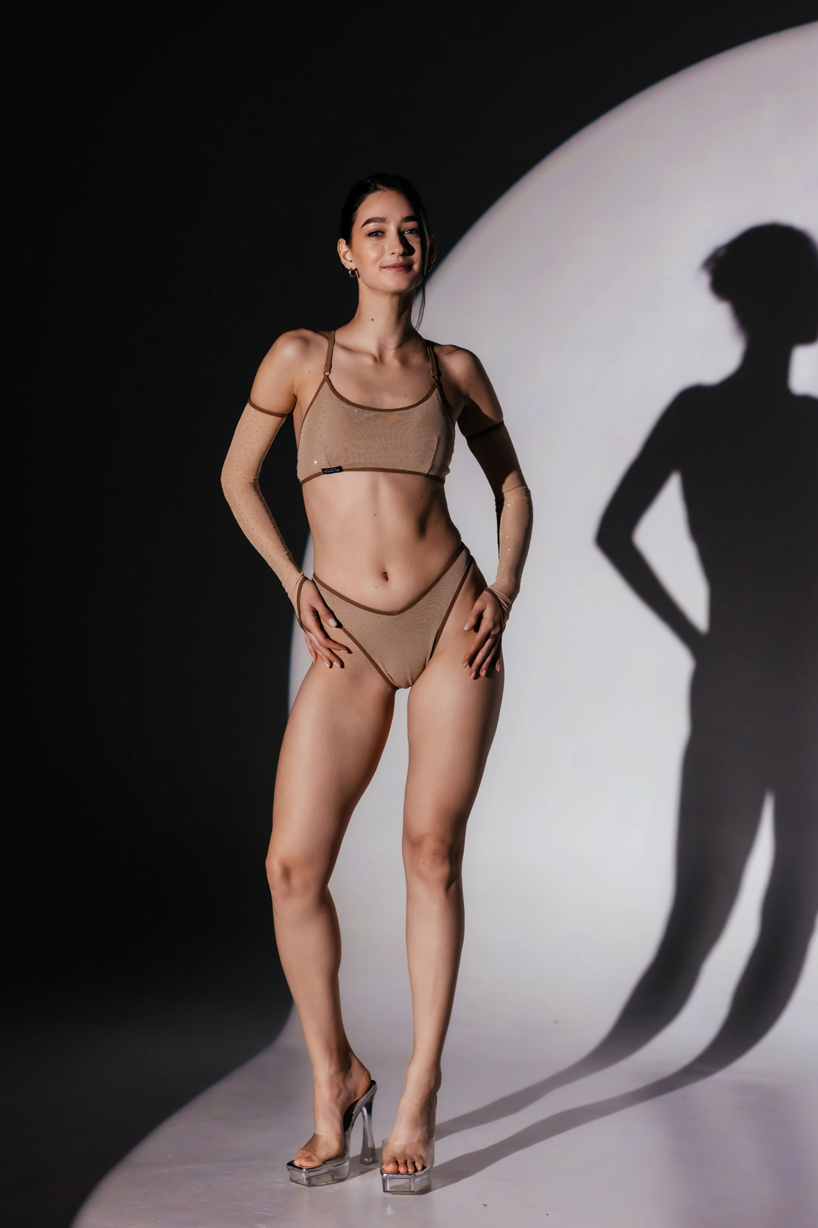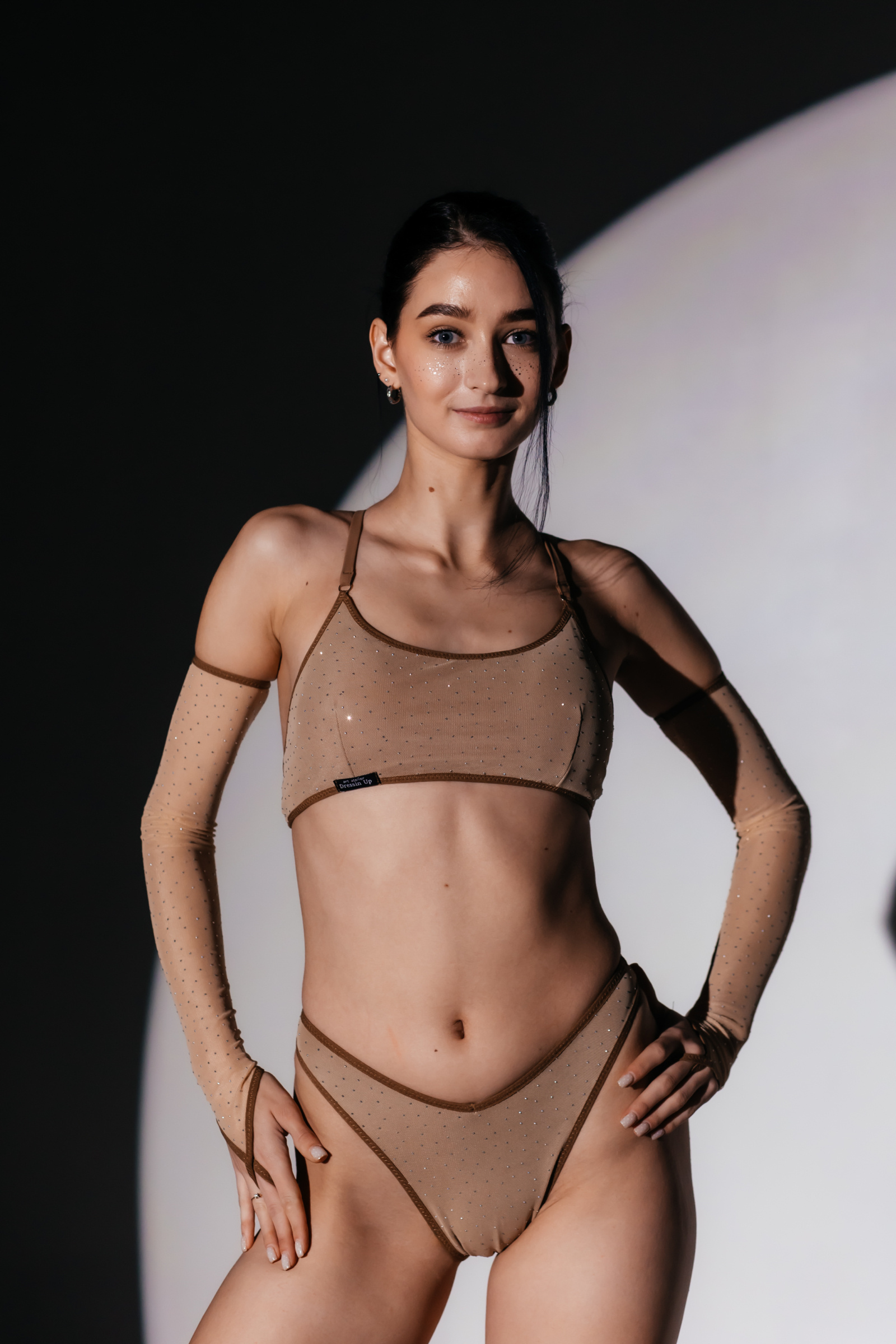 Effortless, sensual, and hypnotic — the SKINELLE сrystal mesh set is created to highlight movement, elegance, and feminine power. The delicate crystal mesh beautifully hugs the body while revealing just enough to stay confident on stage and during training. The soft shimmering stones catch the spotlight with every motion, making the silhouette look sculpted and ethereal. The top includes removable padded cups, allowing you to choose between a natural soft silhouette or additional support and shape — perfect for both training and performances. Lightweight, stretchy and breathable, this set allows full freedom of movement — ideal for exotic dance, pole, high heels, or stage shows.