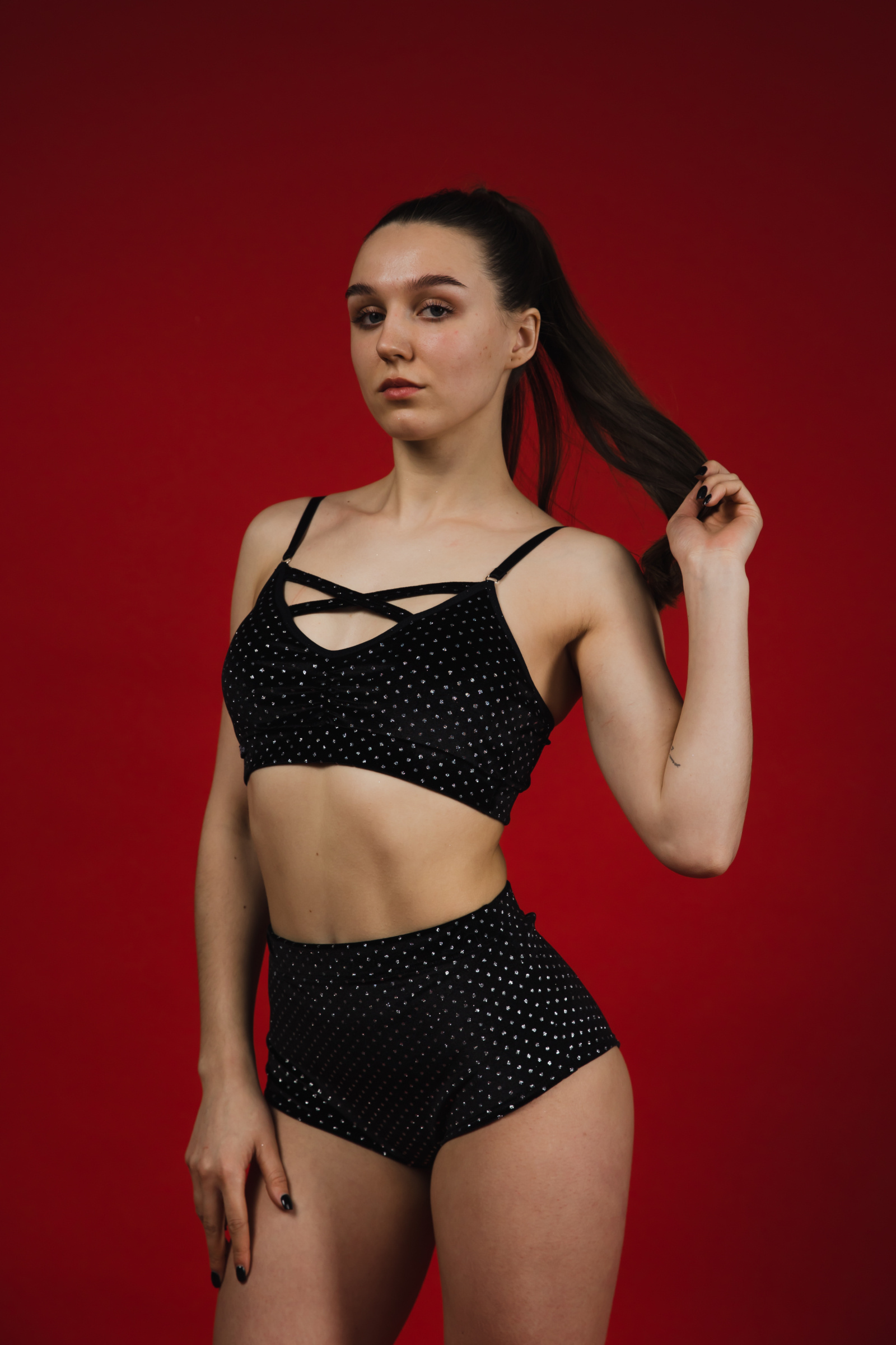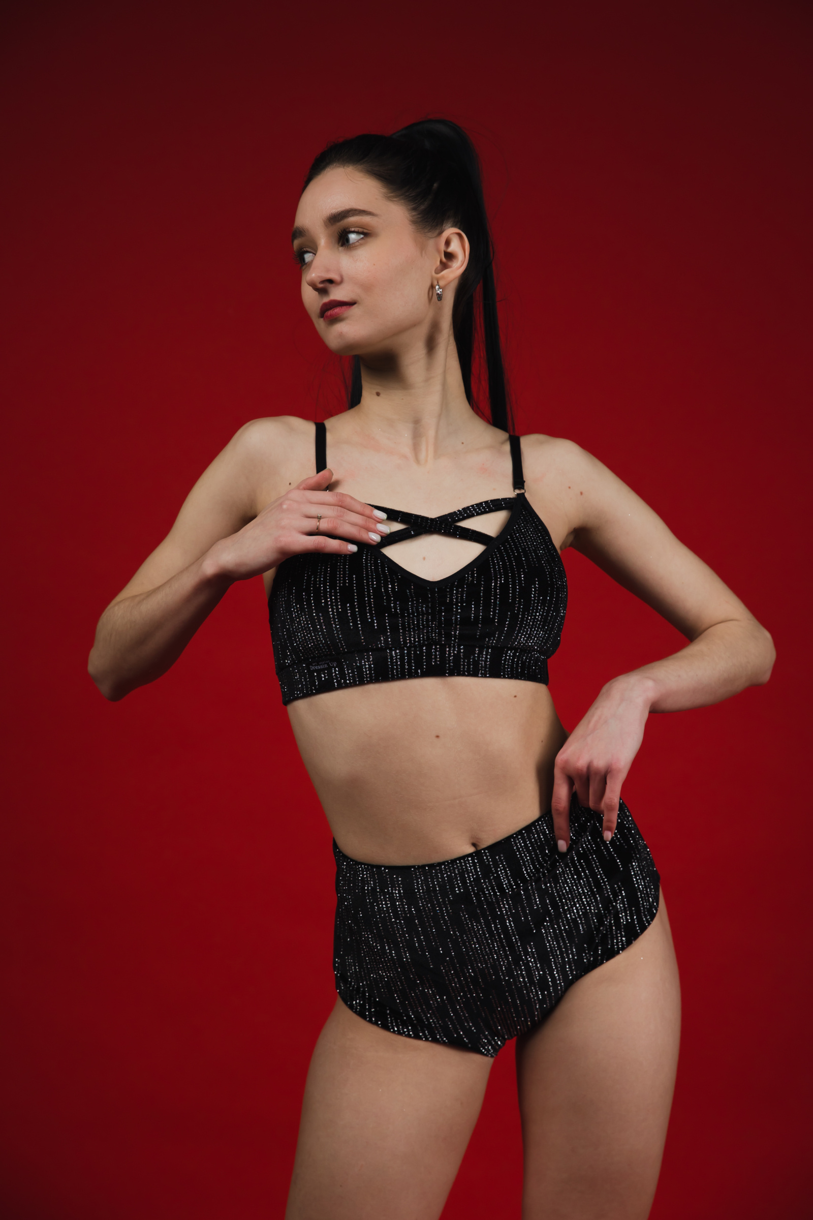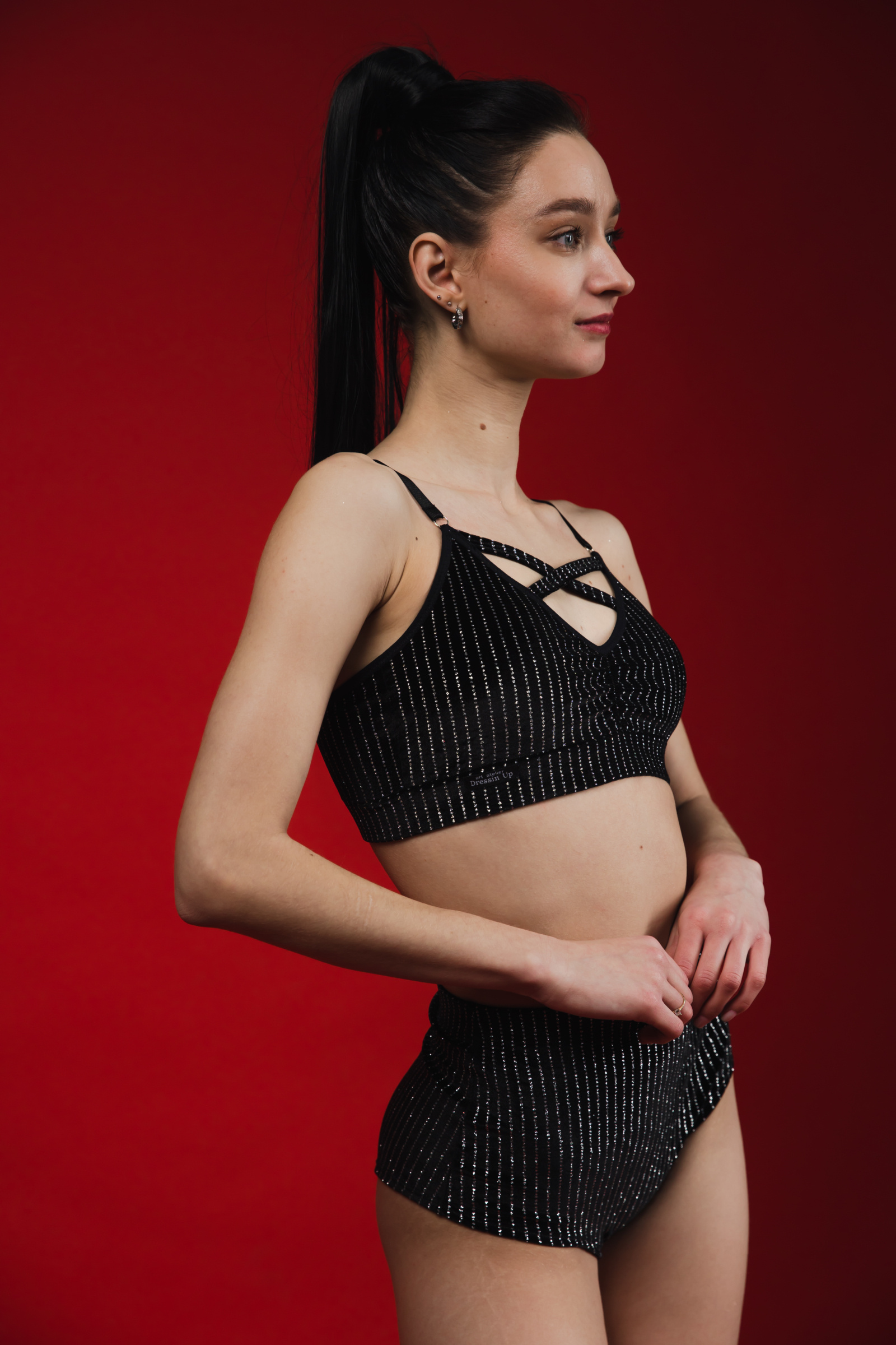 Soft, flexible and radiant — the Sparkle Lurex top moves with you through every performance. The shimmering stretch velvet catches the light beautifully, while the criss-cross strap design highlights your neckline and creates a bold, high-energy stage look. Comfortable support and striking style in one piece — ideal for pole dance, twerk, exotic, go-go, and performance choreography.