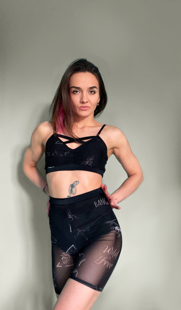 Bold and lightweight — the Tattoo Mesh Set feels like a second skin. Its soft nude stretch fabric with artistic tattoo print highlights your body’s natural lines while keeping every move visible and confident. The cross-strap top adds a sculpted touch, and the sheer biker shorts create a striking, transparent silhouette — perfect for layering or stage performance.